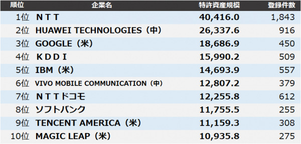 集計の結果、1位 NTT、2位 HUAWEI TECHNOLOGIES(中)、3位 GOOGLE(米)となりました。