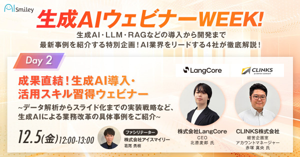 AIポータルメディア「AIsmiley」を運営するアイスマイリー(東京都渋谷区、代表取締役:板羽晃司)は、最先端の生成AI活用に焦点を当てたウェビナーイベント「生成AIウェビナーWEEK!生成AI・LLM・RAGなどの導入から開発まで最新事例を紹介する特別企画!AI業界をリードする4社が徹底解説!」を、2025年12月4日(木)~5日(金)の12時より開催いたします。