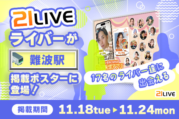 11月18日(火)より、難波駅構内にて21LIVEの広告ポスターの掲出がスタートします。