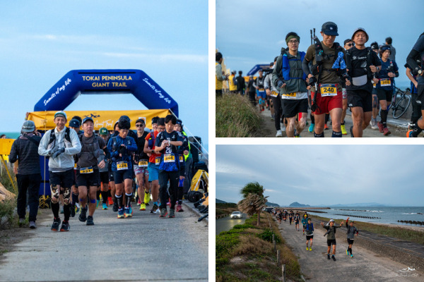 レースは100マイル(160km)部門のみで、ルート上にコーステープなどの目印を設けないノンマーキング形式で行われました。渥美半島の西端部に位置する中山ビーチ(田原市)をスタートし、豊橋市、豊川市、岡崎市、新城市、蒲郡市とたどり、竹島埠頭緑地でゴールを迎えます。前半の70kmは、ロードがメインで、後半に獲得標高が増えるコースレイアウトでした。