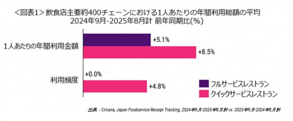 家計簿アプリのデータを活用した「フードサービスレシートトラッキング*2」のデータによると、2024年9月-2025年8月計の飲食店主要約400チェーンにおける1人あたりの年間利用総額の平均は、フルサービスレストランでは前年同期比5.1%増加、クイックサービスレストランでは8.5%増加しました。利用頻度は、フルサービスレストランでは横ばい、クイックサービスレストランでは4.8%増でした。