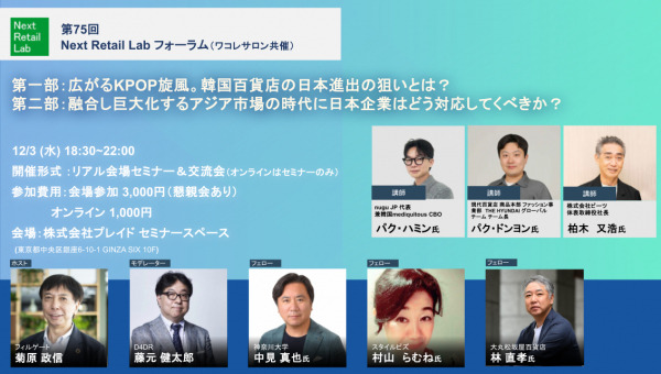 次世代小売流通研究会 Next Retail Lab(港区:代表フィルゲート株式会社菊原政信)は2025年12月3日に第75回フォーラムを開催します。近年、国内ではKPOPの人気が勢いを増しています。今年9月には韓国百貨店THE HYUNDAIが渋谷PARCOに常設店をオープンしました。ここを基点として、韓国アパレルブランドが紹介されています。