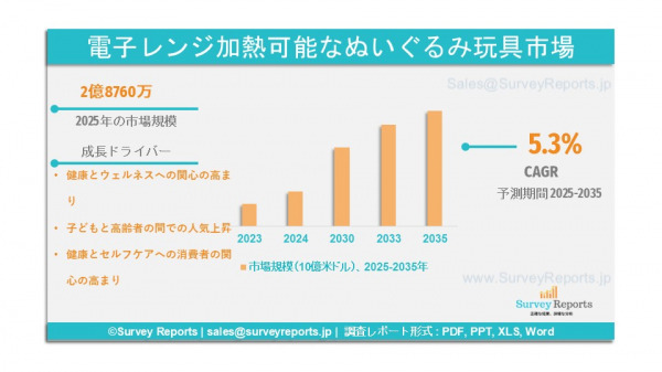 Surveyreports の専門家による分析では、電子レンジ加熱可能なぬいぐるみ玩具市場規模は2025年にUSD 287.6 millionを生み出したとされる。さらに、2035年末までに同市場規模はUSD 476.8 millionに達すると予測されている。また、2025年から2035年の予測期間における年平均成長率(CAGR)は=5.3% と見込まれているのである