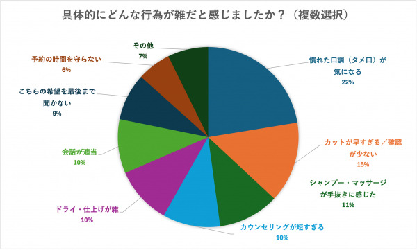 理由として最も多かったのは「タメ口など距離感の変化」。続いて「カットが早い」「シャンプーが雑」「希望を最後まで聞いてくれない」など、施術や接客の丁寧さが低下したと感じるケースが目立ちました。