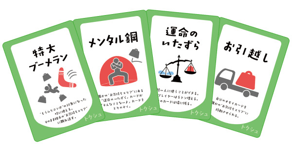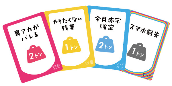 カードには1~3トンの出来事(オモイ)が書かれており、他のプレイヤーに負担を増やすか、自分の負担を軽くするかを毎手番で判断します。