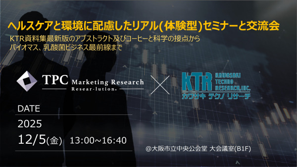 リサ・リューション事業を展開するTPCマーケティングリサーチ株式会社(代表取締役社長:松本 竜馬)は、2025年12月5日(金)に有限会社カワサキテクノリサーチ様主催、TPCマーケティングリサーチ株式会社協賛によるリアルセミナー「ヘルスケアと環境に配慮したリアル(体験型)セミナーと交流会」を開催いたします。