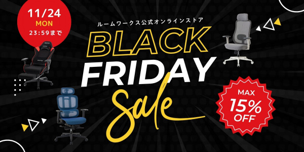 ルームワークス(本社:兵庫県川西市)は、2025年11月21日(金)から11月24日(月・祝)までの4日間、直営オンラインストア「ルームワークス公式オンラインストア」にて「ブラックフライデーセール」を開催いたします。セール期間中はワークファニチャーブランド「ROOM WORKS(ルームワークス)」およびゲーミングチェアブランド「VESTEX(ベステックス)」から厳選された人気モデルを5%~最大15%OFFの特別価格にて販売いたします。
