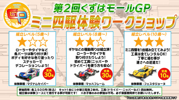 レギュレーション:車幅・車高・タイヤの加工などはミニ四駆公認競技会規則に準じます
