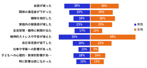モラハラが生活や夫婦関係に与えた影響については、男女とも「精神的ストレスや不安が増えた」(男性33%、女性48%)が最も多く、次いで「会話が減った」(男性28%、女性30%)、「関係の満足度が下がった」(男性22%、女性24%)が続きました。