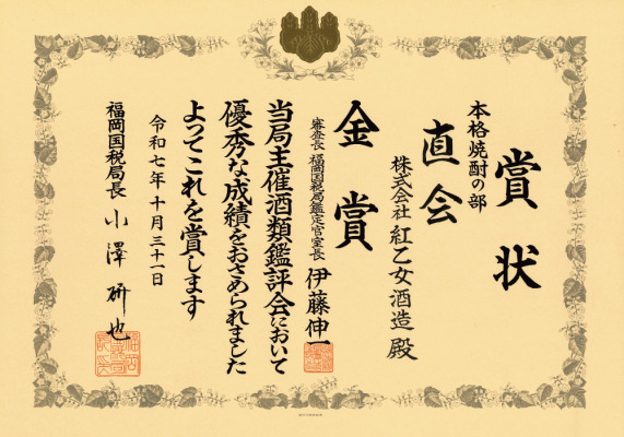 今年度の本格焼酎の部には、31製造場から96点の出品があり最も優れたものから大賞、金賞が選出。紅乙女酒造の出品酒は令和2年より6年連続の金賞受賞となりました。これもひとえに皆様のご厚情の賜物と厚く御礼申し上げます。鑑評会向けの出品酒は特別に仕込んだ焼酎です。麦焼酎「令和七年 金賞受賞酒 直会」を600本限定で販売いたします。