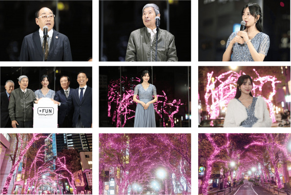 また渋谷駅前共栄会の青山 強志会長からは「これからも皆さんと協力しながら様々なことに取り組んでいきたいと思います。」と挨拶が述べられ、渋谷区の長谷部 健区長からは「ぜひこの桜色のイルミネーションを楽しんでいただき、桜丘に多くの人の注目が集まる機会になると嬉しいです。本日は誠におめでとうございます。」と、開催を祝うコメントが寄せられました。