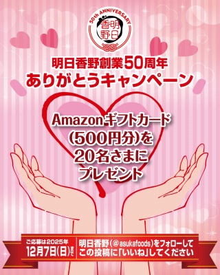 このたび、アマゾンギフトカードをお届けするキャンペーン「明日香野創業50周年ありがとうキャンペーン」を開始しました。キャンペーンの開催期間は2025年11月25日から12月7日までとなります。