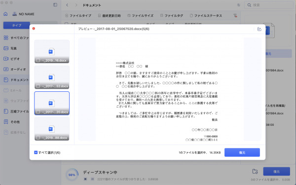 2. しばらく待つと、消してしまったファイルが表示されます。復元前に、写真、ビデオ、音楽、ドキュメントなどのファイルをダブルクリックすることによりプレビューが可能です。