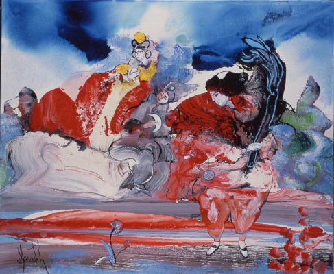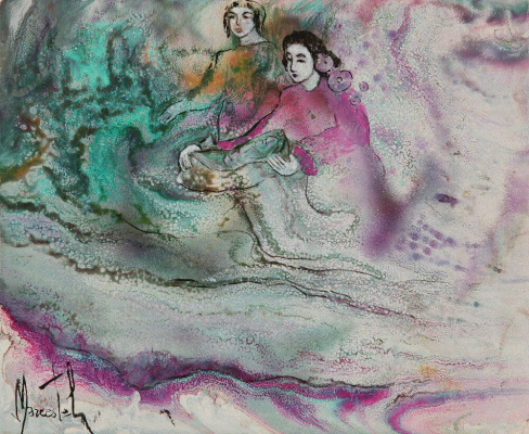 マーク・エステル氏は、水墨画の影響を受けて水彩画で日本の神話を表現した後、油絵による作品も生み出しました。さらに、絵画だけでなく、ブロンズ、陶器、グラスなど、多岐にわたる芸術分野で作品を制作しました。