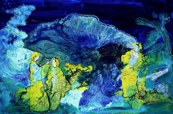 氏が訪日し、神社を訪れた際に神道や日本の神話について話を聞いたことが、創作活動の大きな転機となりました。氏はその時、「神話は自然と深い繋がりがある」と感じ、1990年より日本の古典『古事記』を読み解き始めます。豊かな色彩を用いて、神話から着想を得た風景を浮かび上がらせ、神々の世界をキャンバスに表現しました。