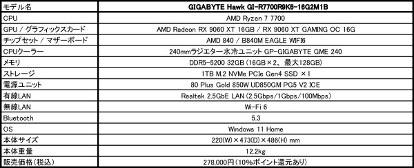 本製品は、メモリにDDR5-5200 32GB、ストレージとしてM.2 NVMe PCI-E Gen4 SSD 1TBを搭載し、OSにはWindows 11 Homeをプリインストール。また、ネットワーク機能としては、2.5Gbps LANとWi-Fi 6、Bluetooth 5.3に対応しています。