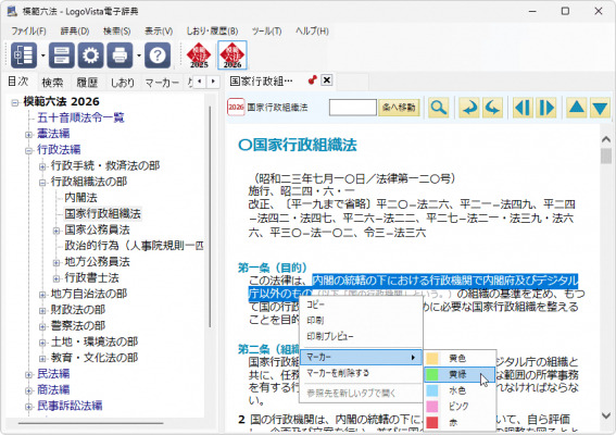 気になる条文や覚えておきたいポイントに、マーカーで色をつけて強調できます。