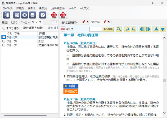 [グループ]一覧から閲覧したいグループ名を選択すれば、グループに含まれる法令をワンクリックで開けます。