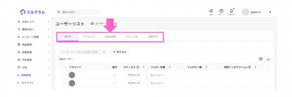 エルグラムのユーザーリストは、ツールに登録されている全ユーザーを一覧で確認できる基本機能です。絞り込み機能を使えば、特定の条件や行動を持つユーザーだけを抽出することもできます。