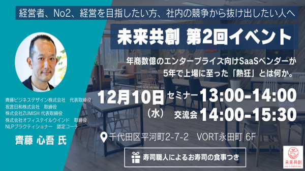 今回のテーマは「年商数億のエンタープライズ向けSaaSベンダーが5年で上場に至った『熱狂』とは何か」。経営者、No.2、経営を目指したい方、社内の“壁”から抜け出したい方に向け、実体験に基づく本質的な学びを提供します。