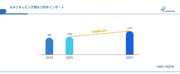 セルフタッピング用ネジ付きインサート市場は、安定した技術成熟期に入りながらも、新素材・軽量化・EV化といったマクロトレンドの影響を受けて着実な成長を続けている。LP Informationの最新レポート「世界セルフタッピング用ネジ付きインサート市場の成長予測2025~2031」(https://www.lpinformation.jp/reports/387105/self-tapping-threaded-inserts)によれば、2025年から2031年にかけての年平均成長率(CAGR)は4.6%と予測され、2031年には市場規模が1.37億米ドルに達する見込みである。この緩やかかつ堅実な成長曲線は、部品単価の安定性と用途の多様化によって裏付けられている。また、特に樹脂部品の増加やリサイクル材の活用が進む中、セルフタッピング型インサートの需要は“後工程不要”という工数削減ニーズと完璧に一致し、今後さらに産業横断的な採用が広がることが想定される。