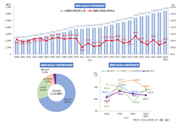◆2024年(1月~12月)の通販化粧品市場は、前年比2.0%増の6,203億円となり、2000年の調査開始以来、24年連続で過去最高を更新した。市場規模は2000年比で約3倍へと拡大しており、スマートフォンの普及による日常的なオンライン購入習慣の定着や、外部ECモールによる接点拡大、デジタル広告手法の高度化が、市場拡大の基盤として確固たる役割を果たしている。