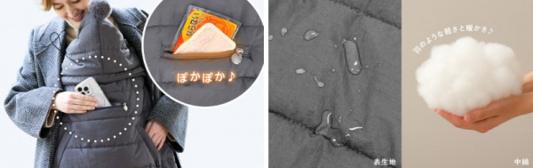 背面には、スマートフォンや小物を入れられるファスナー付きポケット(ハグポケ)を搭載。カイロを入れておけば、あたたかさもアップ。さらに、ママの手を温めるあったかポケットも裏地はポーラーフリースで、冷えがちな手先を優しく包みます。