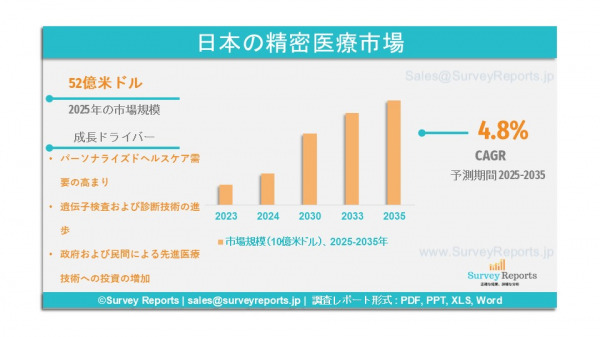 Surveyreports の専門家による分析では、日本のプレシジョンメディシン市場規模は2025年に USD5.2billion を生み出したことが判明した。さらに、2035年末には市場収益がUSD7.8billion に到達すると予測されている。日本のプレシジョンメディシン市場は、2025年から2035年の予測期間において約CAGR=4.8% の成長率で推移すると提案されているのである。