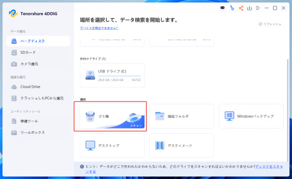 ステップ1.Tenorshare 4DDiGが起動後の画面で、Windowsの「ごみ箱」を選択し、「スキャン」をクリックします。