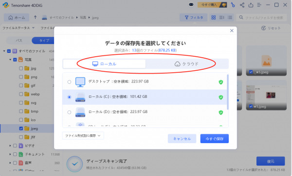ステップ3.右下の「復元」をクリックし、復元したファイルの保存場所を選択し、例えばOneDriveまたはGoogle Driveなどのクラウドディスクに保存することを検討してください。