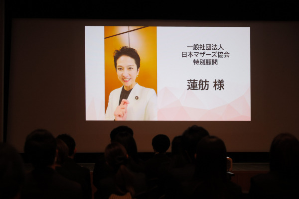日本マザーズ協会特別顧問で参議院議員・蓮舫氏より、受賞企業様への祝辞。そして、ご自身の子育て時代と対比して商品・サービスの進化、子育てを楽しむ為の時短商品や、ママ自身の為の商品など、様々な時代の変化を感じている事などを話題にされました。そして、受賞企業様の日々のご努力への敬意と感謝の想いをお伝え致しました。(※当日は国会都合により欠席にて動画メッセージによる参加。)