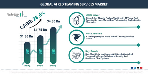 AIレッドチーミングサービス市場は堅調な成長を続けており、2024年の13億6000万ドルから2025年には17億5000万ドルへ拡大し、29.0%の強い年平均成長率を示している。この勢いは、サイバー脅威の深刻化、企業によるAI導入の拡大、遵守基準の進化、そしてAIアーキテクチャの高度化と複雑化といった過去の要因に支えられている。組織は、実際の攻撃者に悪用される前に脆弱性を特定するため、予防的なテスト枠組みを優先してきた。