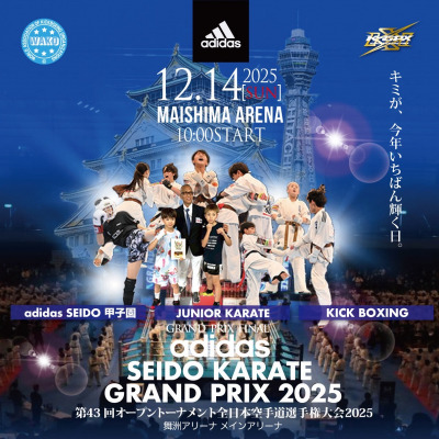 「adidas SEIDO KARATE GRAND PRIX」について adidas SEIDO KARATE GRAND PRIXは、正道会館が主催する全日本空手道選手権大会であり、各クラスの頂点を決める日本最大級の空手トーナメントです。本年も全国から集結したトップ選手たちによる、熱い戦いが繰り広げられることが期待されます。