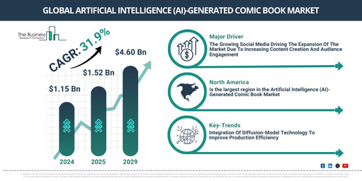 二〇二九年までに市場規模は四十六億米ドルに達し、年平均成長率三一・九パーセントで成長すると予測されています。成長を促進する主な要因には、個別化された物語体験への需要拡大、多様性と包括性を重視したコミック表現への関心の高まり、対話型読書形式の普及、アーティストと人工知能制作者の協業拡大、セルフパブリッシング活動の増加、ファン生成コンテンツの商業化があります。今後は、文章から画像を生成する技術の進化、リアルタイム場面描写、没入型マルチモーダル物語、人工知能主導のアニメーション、感情適応型ナラティブ技術の進展が期待されています。