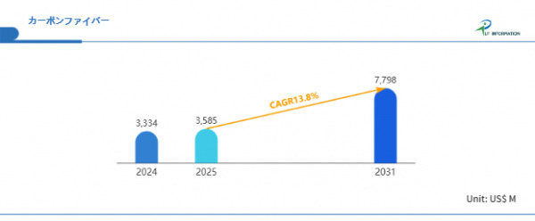 LP Information調査チームの最新レポートである「世界カーボンファイバー市場の成長予測2025~2031」(https://www.lpinformation.jp/reports/143752/carbon-fiber)によると、2025年から2031年の予測期間中のCAGRが13.8%で、2031年までにグローバルカーボンファイバー市場規模は77.9億米ドルに達すると予測されている。