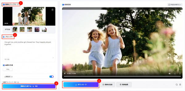 必要な情報/素材を入力 or アップロード後、「動画を生成する」ボタンをクリック。数十秒~数分で AI が動画を生成。生成後は、プレビューで内容を確認できます。問題なければ、そのまま動画をダウンロードまたは共有可能。