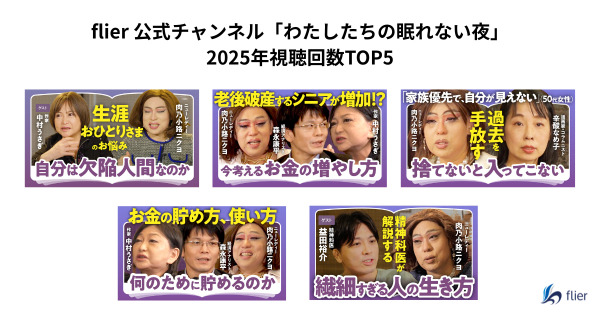 「flier 公式チャンネル」では、ベストセラー著者から経営者、専門家、タレントまで幅広いジャンルの著名人へのディープなインタビュー番組として、学びを深める多様な動画コンテンツを配信しています。2023年5月から本格始動し、約2年で16万人の登録者数を達成。累計視聴数は3,110万回超となり、働き盛りのビジネスパーソンや知的好奇心の高い視聴者を中心に、多くのファンを獲得しています。