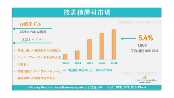 Surveyreports の専門家による集成材市場の分析によれば、2025 年の市場規模は USD 7.9 Billion であった。また、2035 年末には USD 13.8 Billion に達すると予測されている。集成材市場は 2025~2035 年の予測期間において約 5.4% の CAGR で成長すると見込まれているのである。