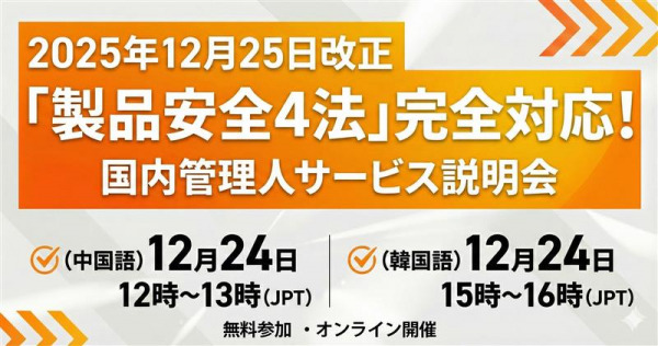 都港区、代表取締役:伊藤彰弘)は、2025年12月25日に施行される日本の製品安全4法(PSE、PSC等)の改正に伴う「特定輸入事業者」および「国内管理人」の選任義務化について、中国・韓国のEC企業様を対象としたオンラインセミナーを下記の通り開催いたします。