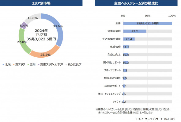 ◆2024年の世界における健康食品市場は前年比4.4%増の35兆3,022.5億円となった。エリア別の市場では北米が構成比33.6%を占めて最大となっており、以下東アジア(日本、中国、韓国、台湾)が同25.2%、欧州が同22.0%、東南アジア・太平洋(インドなど一部南アジアを含む)が同5.4%、その他エリア(南米、中東、アフリカ)が同13.8%と続いている。