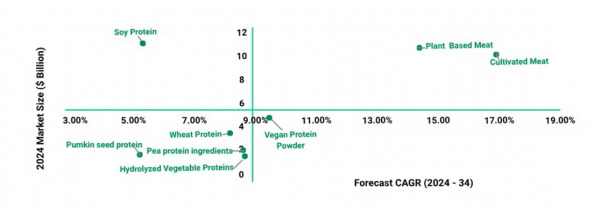 ● 大豆タンパク質は最大規模を維持しているが、新しいタンパク質が注目される中で成長率は比較的穏やかである。