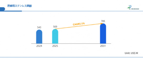 LP Information調査チームの最新レポートである「世界医療用ステンレス鋼線市場の成長予測2025~2031」(https://www.lpinformation.jp/reports/258080/medical-stainless-steel-wire)によると、2025年から2031年の予測期間中のCAGRが5.5%で、2031年までにグローバル医療用ステンレス鋼線市場規模は7.85億米ドルに達すると予測されている。