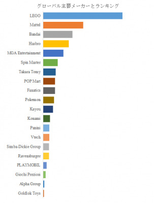 企業別の勢力図は、LEGOが首位、Mattelが第二位、Bandaiが第三位という構造が示す通り、IP力、企画力、生産体制が市場リーダーを決定づける。LEGOは欧州を中心に世界的ブランド力を確立し、教育・エンターテインメントを横断するエコシステムを築いている。MattelはBarbieやHot WheelsといったグローバルIPを軸に、映像化やイベント展開を強化している。Bandaiは日本発のキャラクターIPを世界展開し、玩具とホビー、エンタメを統合したモデルが特徴である。