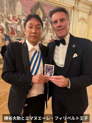 この度の贈呈は、広島で被爆し、白血病と闘いながら「生きたい」という願いを込めて折り鶴を折り続けた少女、佐々木禎子さんの遺志を国境を越えて伝えるものです。 エマヌエーレ・フィリベルト殿下に、禎子さんが残した平和へのメッセージと折り鶴の背景をご説明し、その象徴であるピンバッジを受け取っていただきました。