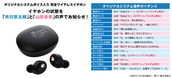 本コラボレーションモデルは、左右ハウジングに「秋田けんたろう」と「秋田けんじろう」、充電ケース天面に「作品タイトル」を配置。音声ガイダンスは「市川京太郎」と「山田杏奈」の掛け合いボイスを搭載。電源オンやオフ、ペアリング時やタップ音等のオリジナルボイスを楽しめます。パッケージは描き下ろしイラストデザインとなっております。