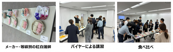 幅広い品揃えをしているからこそ、商品知識の習得が大切と考えています。毎年の新入社員研修や中途社員研修でも、蒲鉾勉強会を実施。各地域の蒲鉾の特徴をバイヤーが講師となって説明しています。実際に試食し、味の特徴も学び、お客様が店舗でお買い物される際に、お買い物のお手伝いができるように努めています。