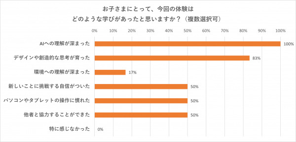 また、参加した子どもたちの保護者アンケートでは「AIへの理解が深まった」の回答が100%だったほか、下