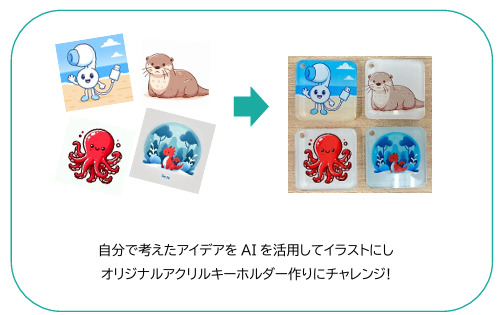 同ワークショップは、AI講座、デザイン講座、ものづくりが一度に体験でき、総合的にデジタルクリエイティブを学ぶことができる内容となっています。ものづくりではAIを活用して、オリジナルアクリルキーホルダー作りにチャレンジし、ワークシートと振り返りプリントもお渡しいたします。