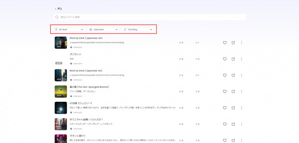 2.作品閲覧・検索機能:公開されている楽曲をジャンル・言語・新着順などで検索可能。気になる作品をすぐに見つけ、再生・お気に入り登録ができます。