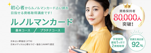 講座で学ぶ内容は日本占い師協会の「ルノルマンカード占いアドバイザー」(https://www.uranai.org/lenorman/)、日本メディカル心理セラピー協会の「ルノルマンカード士(R)」(https://www.domap.net/uranai/lenorman/)それぞれの資格試験対策になっています。